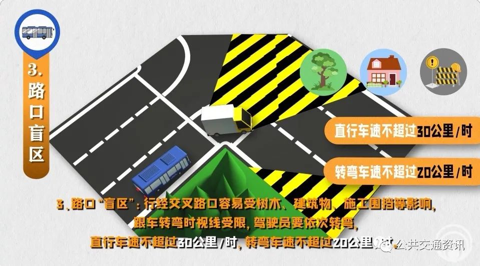 3、路口“盲區(qū)”:行經(jīng)交叉路口容易受樹木、建筑物、施工圍擋等影響,跟車轉(zhuǎn)彎時(shí)視線受限,駕駛員要依次轉(zhuǎn)彎,直行車速不超過30公里/時(shí),轉(zhuǎn)彎車速不超過20公里/時(shí)。