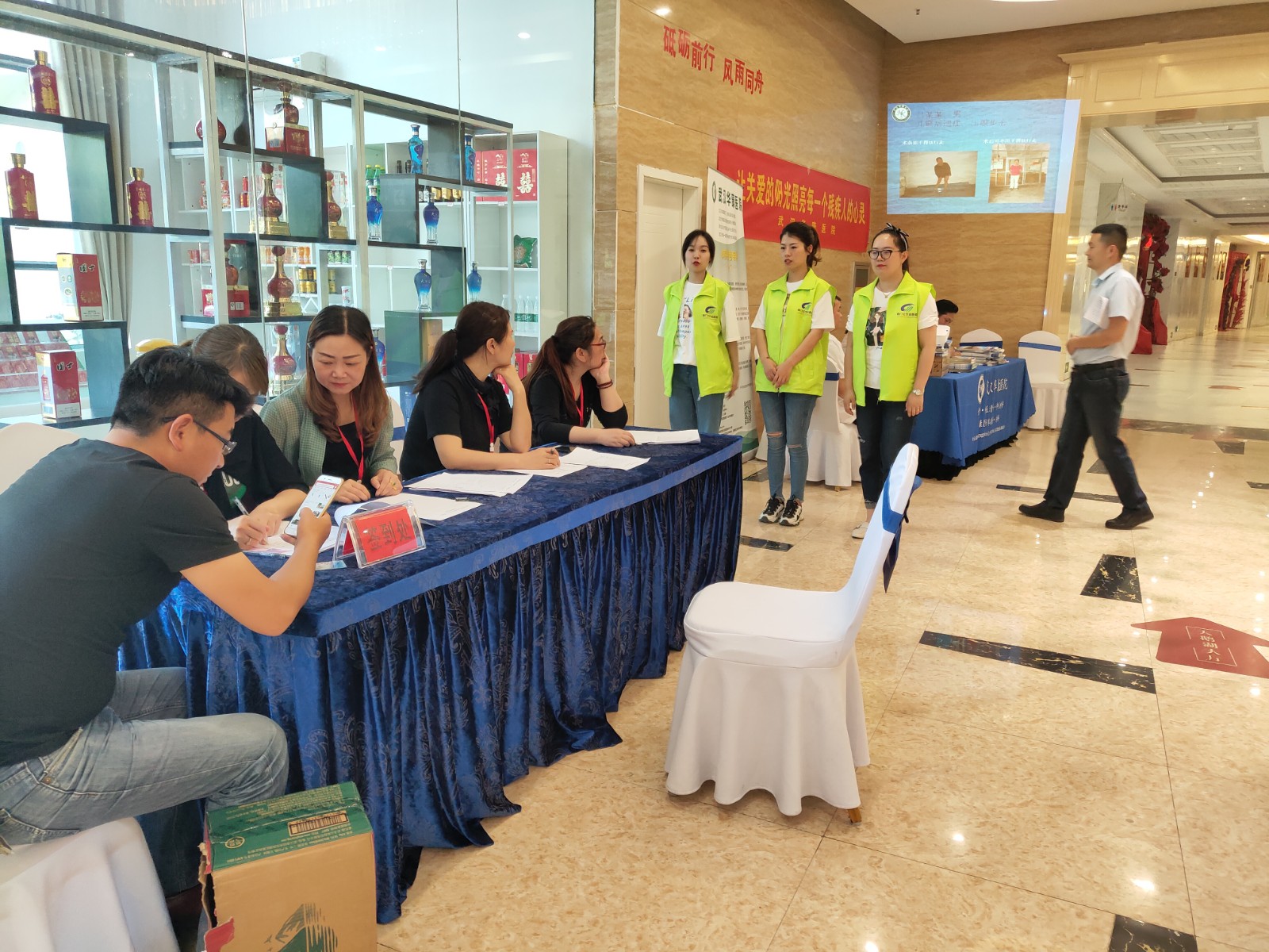(▲圖為 簽到處 公交志愿者們等候殘疾家庭到來)