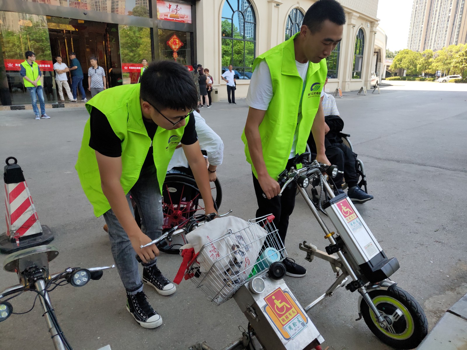 (▲圖為 公交志愿者幫輪椅殘疾人將輪椅機頭整齊擺放)