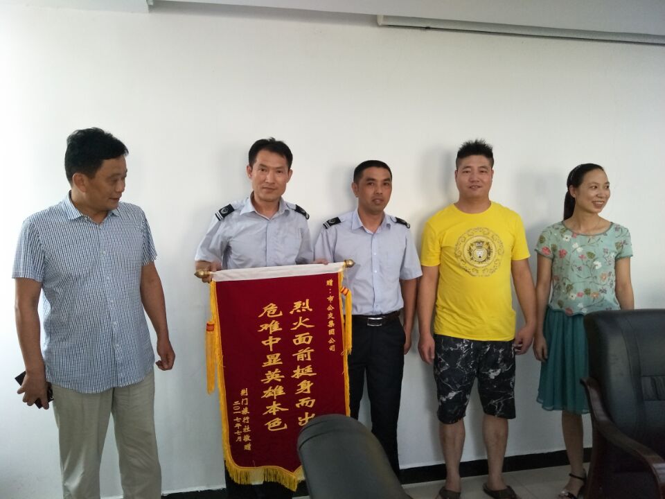 7月27日,荊門市旅行社出租汽車公司負(fù)責(zé)人及鄂H0A073的駕駛員專程來到荊門公交集團公司,為果斷義舉滅火的公交陳旭師傅送上了一面“烈火面前挺身而出,危難中顯英雄本色”錦旗。
